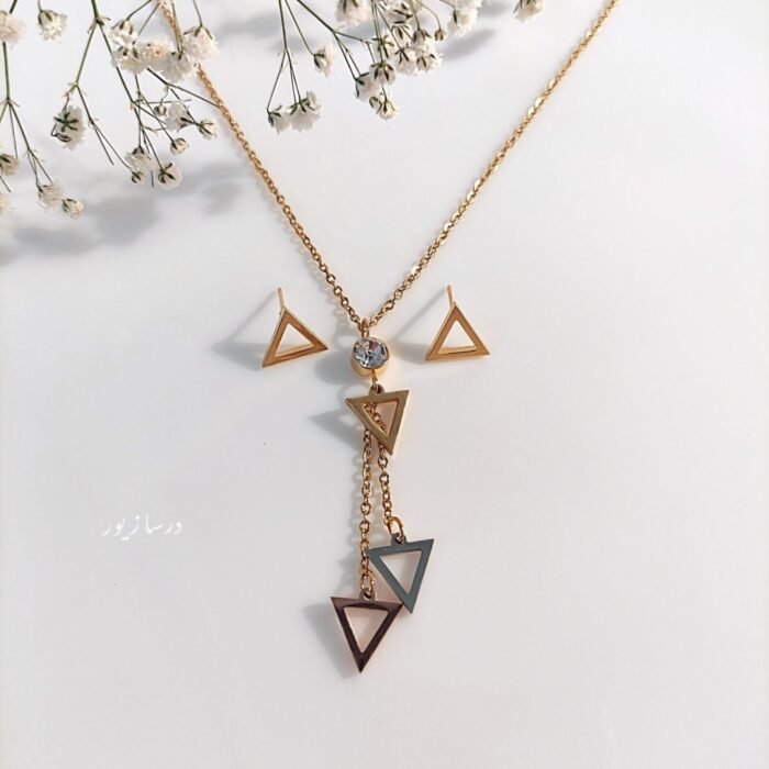 نیم ست مثلث سه رنگ (طلایی،سیلور،رز گلد) از جنس استیل است،با تک نگین گرد اسواروسکی،این کار آبکاری طلای 18 عیار می باشد و رنگ ثابت و بدون حساسیت است.