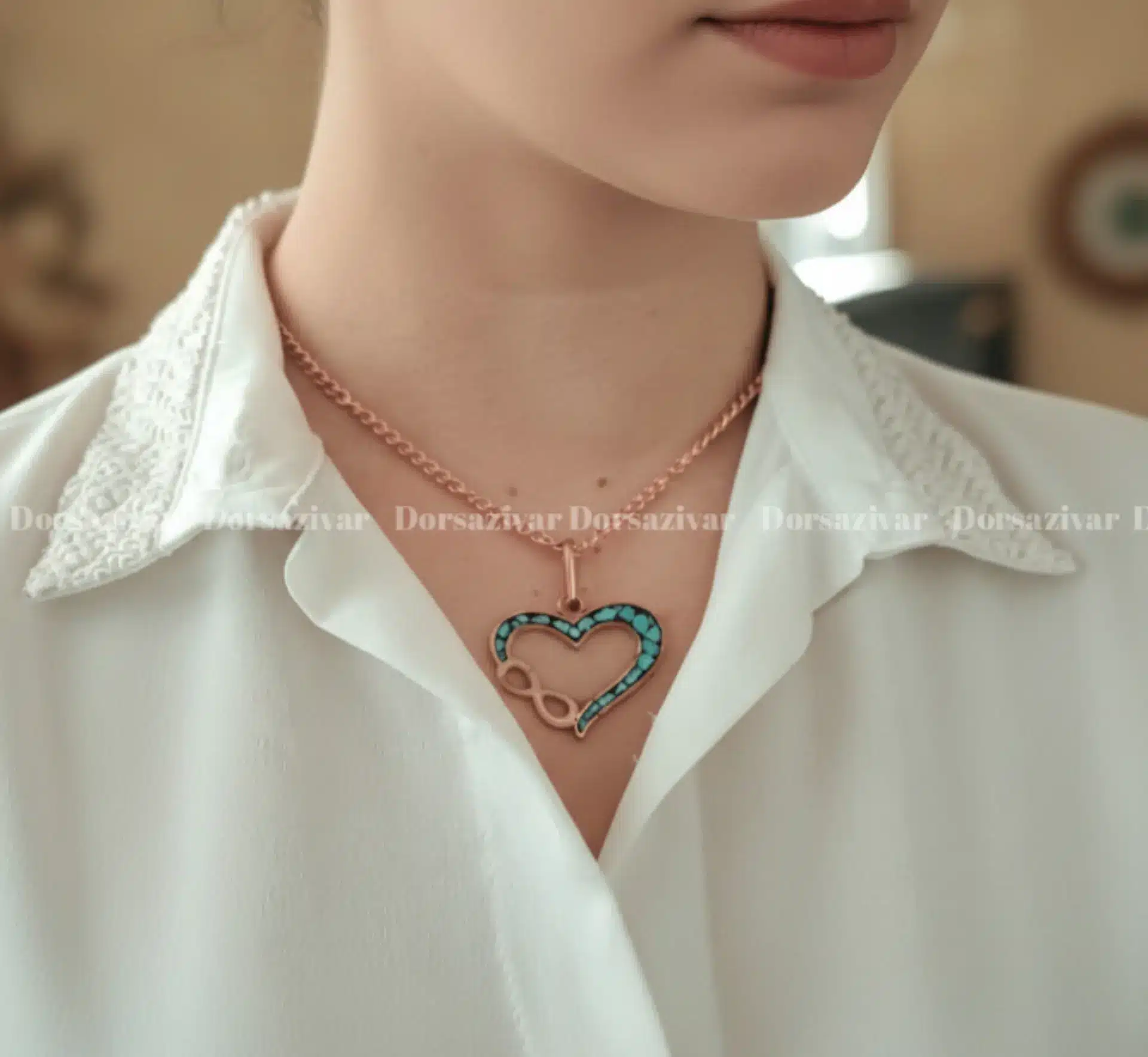 نماد قلب بینهایت یک طراحی شگفتانگیز و معنادار است که ترکیب دو نماد پرمعنی یعنی قلب و علامت بینهایت را به همراه دارد. قلب نمادی از عشق، محبت و احساسات عمیق است، در حالی که علامت بینهایت نشاندهنده ابدیت و بیپایانی است. این ترکیب به معنای عشق و ارتباطی است که هیچگاه تمام نمیشود و همواره ادامه خواهد داشت. در طراحی گردنبند مس و فیروزه پرنسا، این نماد به شکلی هنری و زیبا گنجانده شده و جلوهای خاص به گردنبند بخشیده است.