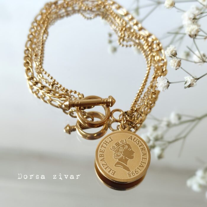 - دستبند سه لاین سکه الیزابت از زیباترین زیورآلات ترند سال می باشد.طرح روی سکه الیزابت دوم استرالیا هست،مربوط به سکه های سال 1998 این کشور(مربوط به سکه الیزابت تاج بلند)است.